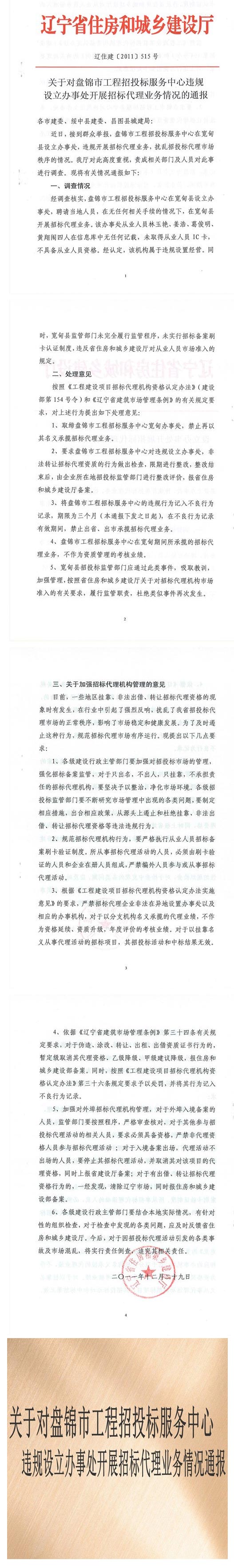 【概要描述】關(guān)于對盤錦市工程招投標(biāo)服務(wù)中心違規(guī)設(shè)立辦事處開展招標(biāo)代理業(yè)務(wù)情況通報