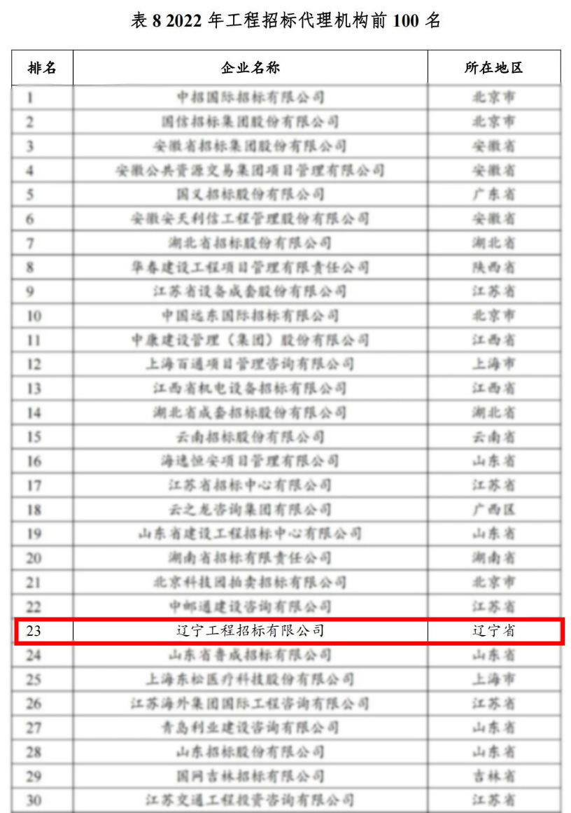2023年8月,中國(guó)土木工程學(xué)會(huì)建筑市場(chǎng)與招標(biāo)投標(biāo)研究分會(huì)組織編寫了《2022年度工程招標(biāo)代理行業(yè)發(fā)展報(bào)告》,報(bào)告公布的2022年工程招標(biāo)代理機(jī)構(gòu)百?gòu)?qiáng)名單中,公司作為遼寧省唯一入選代理機(jī)構(gòu),榮獲全國(guó)第23名。